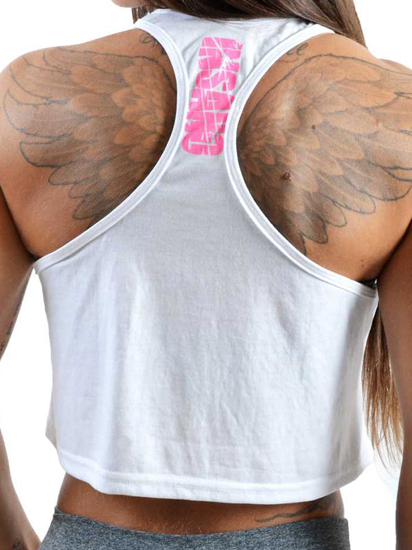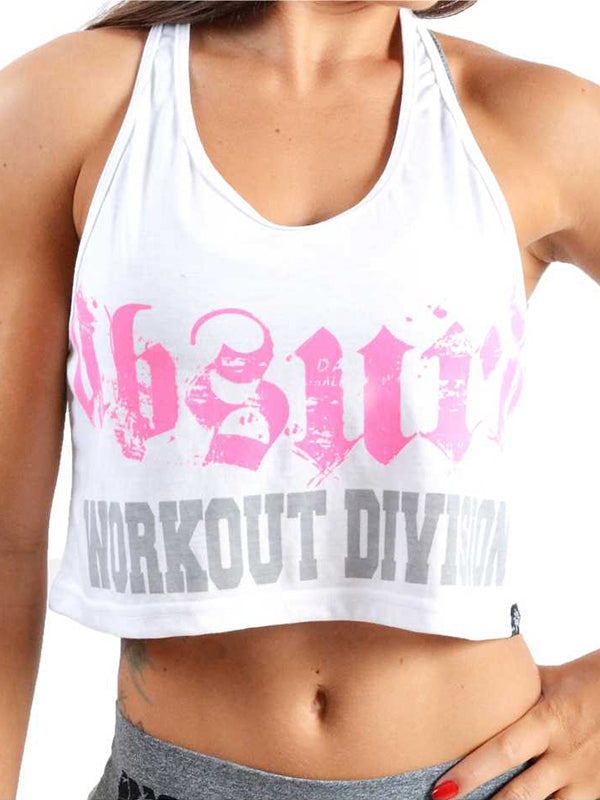 軽くて着心地の良い生地を使用した、どんなボトムスにも合う、とてもキュートなクロップ レーサーバック タンク。ピンクのプリントで Absurd Wourkout Division をフィーチャーしています。