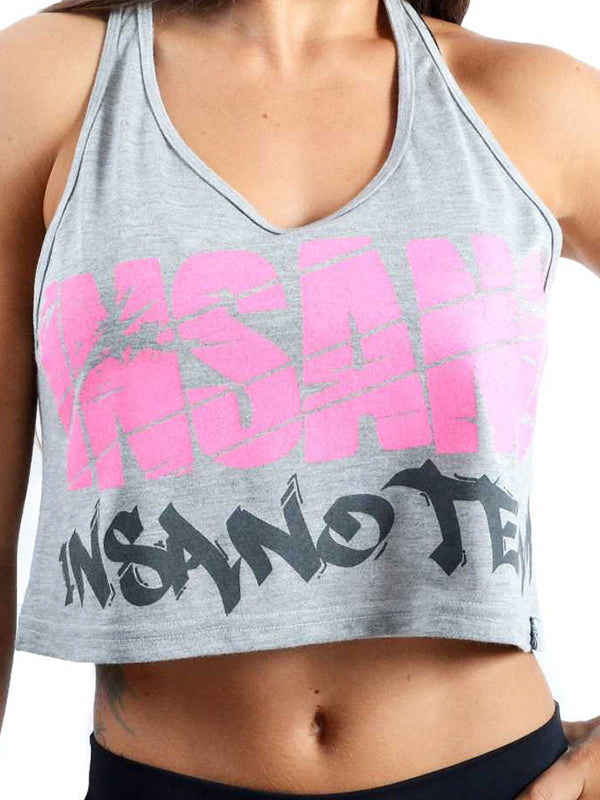 軽くて快適な生地を使用した、どんなボトムスにも合う、とてもキュートなクロップ レーサーバック タンク。ピンクの Insano Destroyer プリントが特徴です。