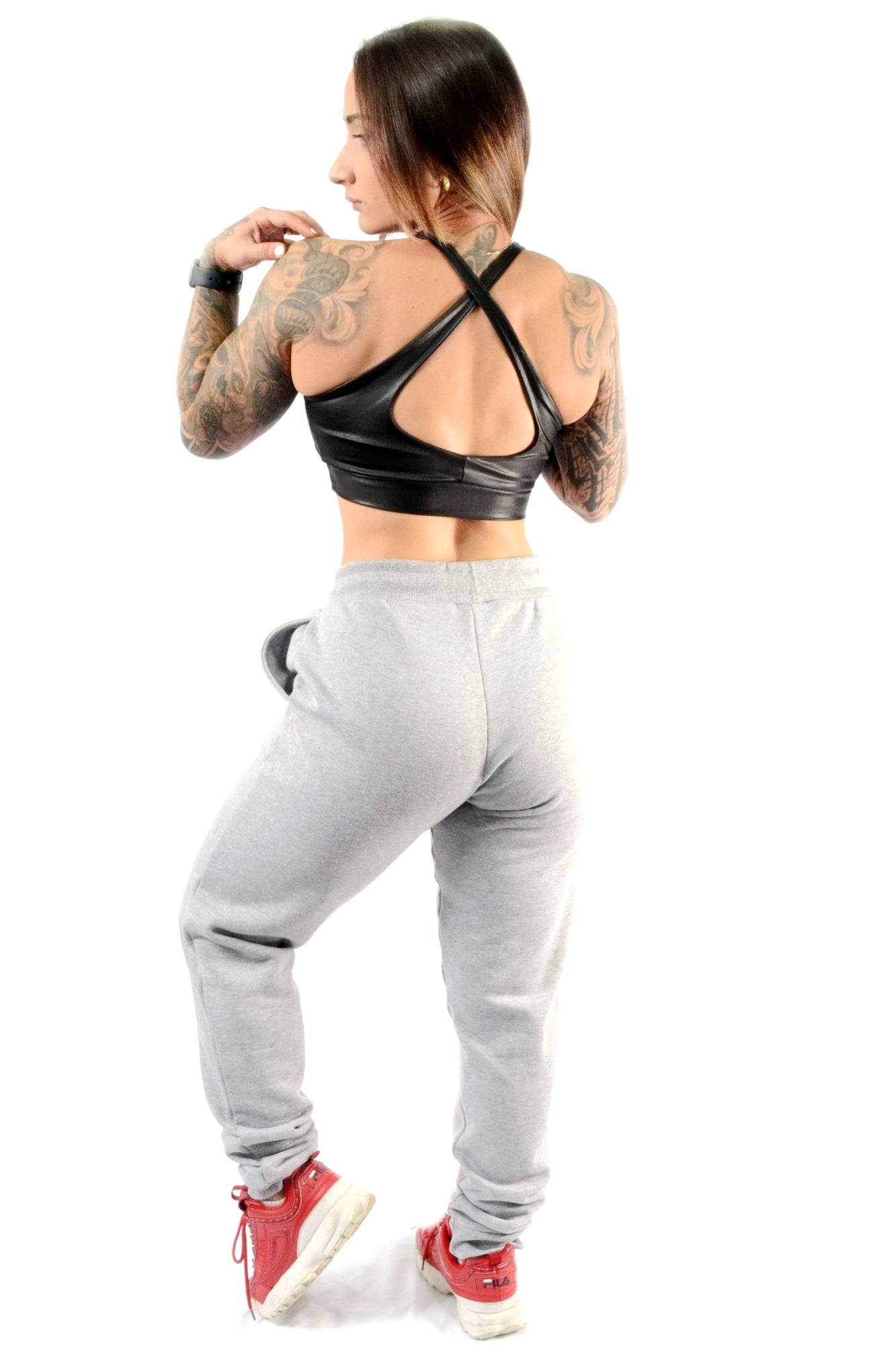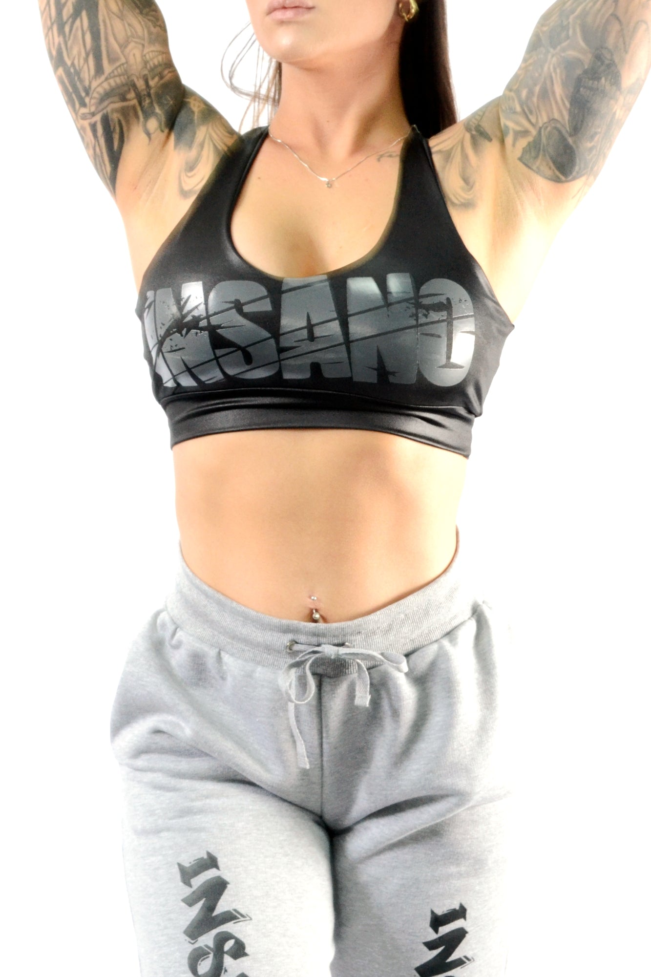 Turn heads while you work out with the Crossed Straps Sports Bra Shiny Cire. Crafted from shiny cire fabric, it features crossed straps that can be worn either in the front or the back for a stylish look. The dark print adds the perfect finishing touch.