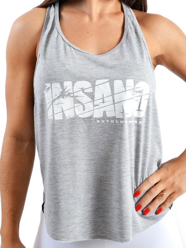 Super comfy and stretchy drop armhole racerback tank. Has a loose fit. Curved laser cutted hem. Feats Insano Destroyer print.