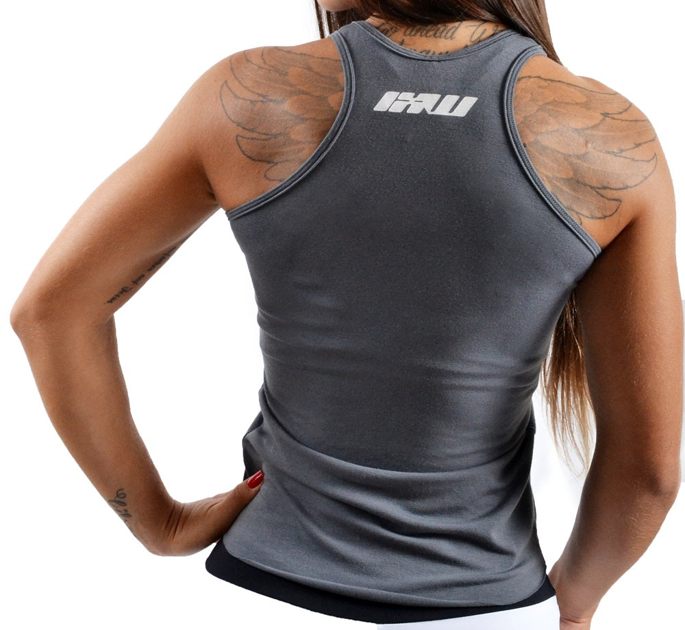 Super comfy and stretchy racerback tank. Has a next-to-skin fit. Curved laser cutted hem. Feats Insano Workout Division print.