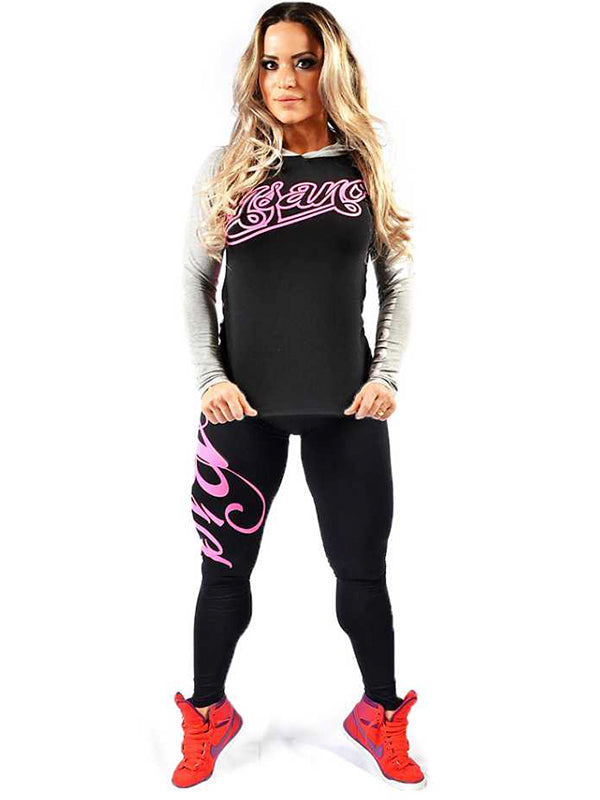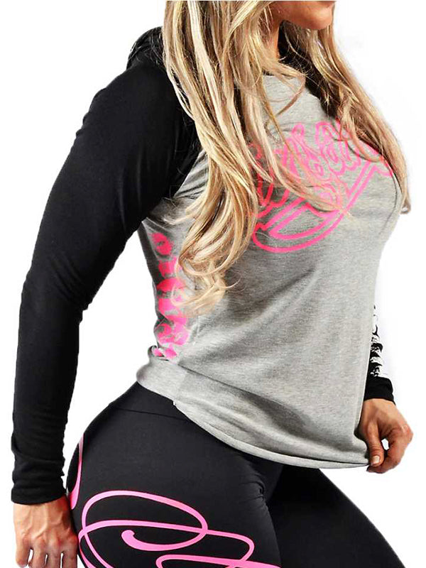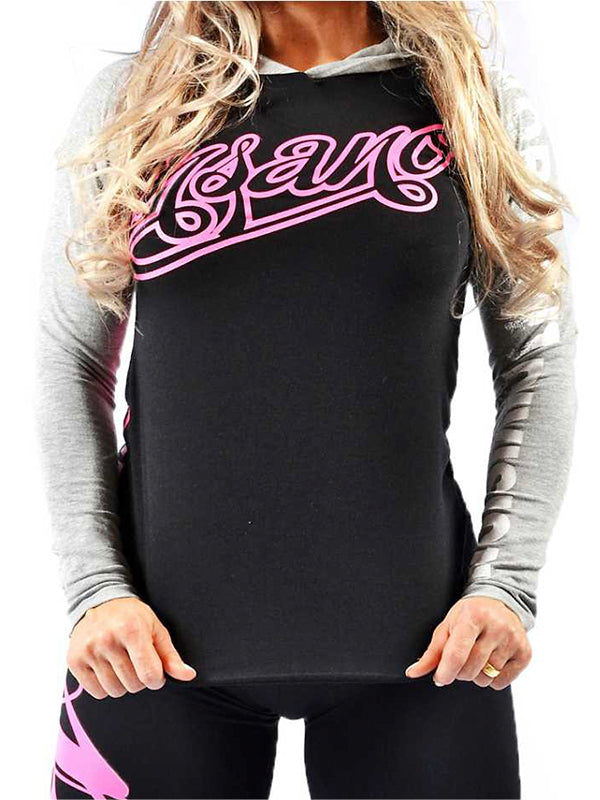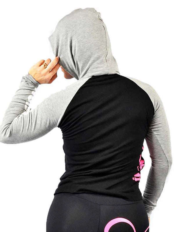 This super cute two tone hooded long sleeve has a curved laser cutted hem and a raglan style. Feats INSANO Curly print in pink. Made in a very stretchy and light type of fabric, it is super comfortable and it allows you to do any kind of movement. It's fabric is also anti-odor. You can wear it at the gym or casual.
